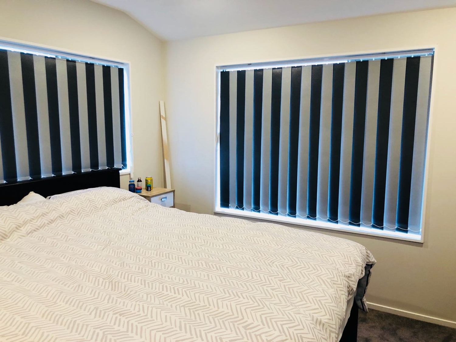 Made of vertical slats (fabric, vinyl, or wood) hanging from a top track. Adjustable for light and privacy. Ideal for large windows or sliding doors.